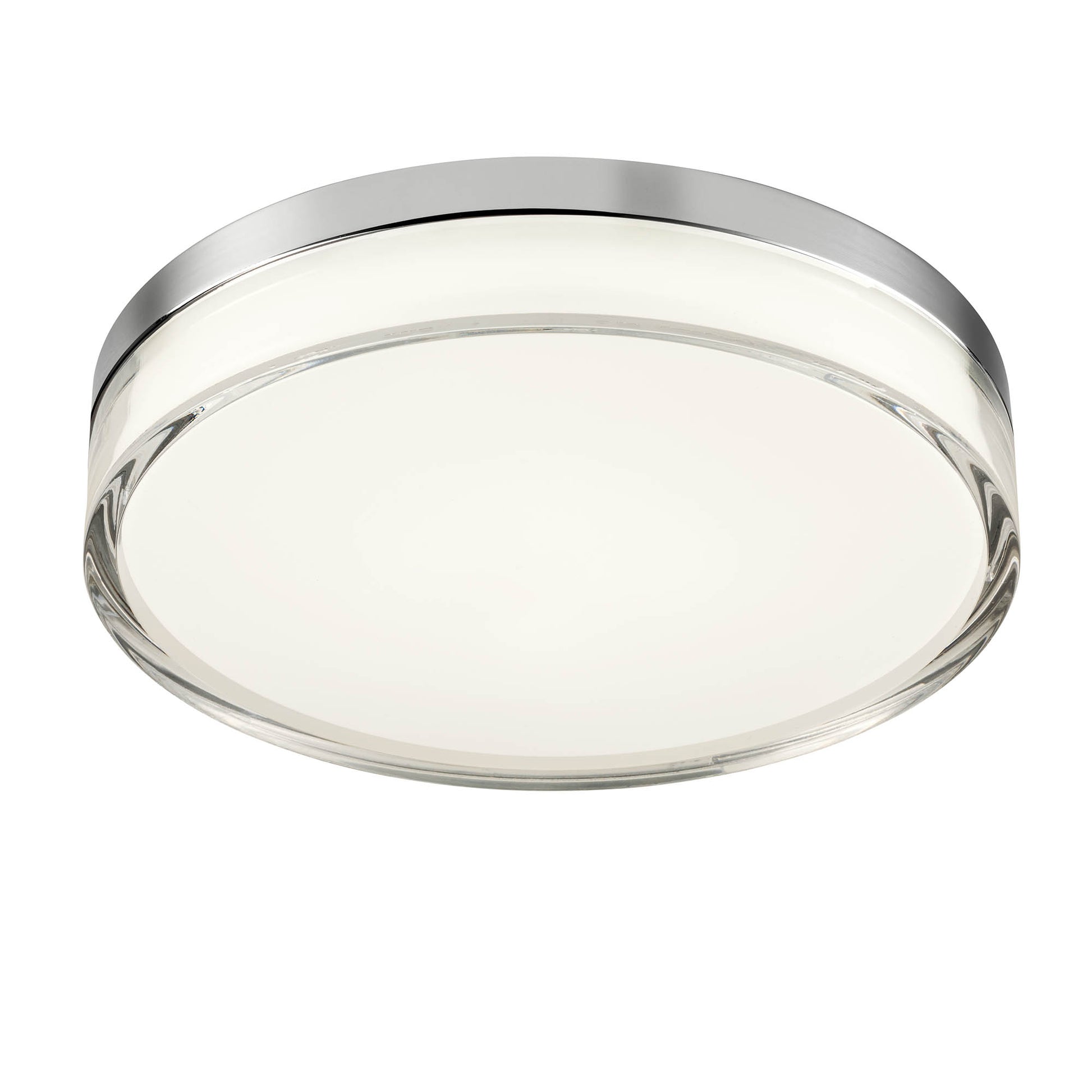 Plafoniera per interni protetta contro l’umidità, dotata di LED SMD, con possibilità di selezionare la temperatura colore della luce, struttura in alluminio cromato, diffusore in PMMA verniciato bianco all’interno e trasparente all’esterno.
